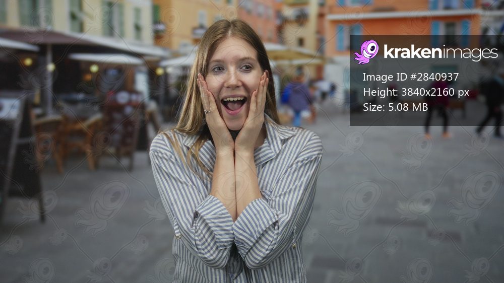 Young blonde woman cups cheeks with hands while smiling at a street restaurant terrace outdoors; happiness.