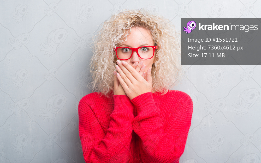 Young blonde woman with curly hair over grunge grey background shocked covering mouth with hands for mistake. Secret concept.