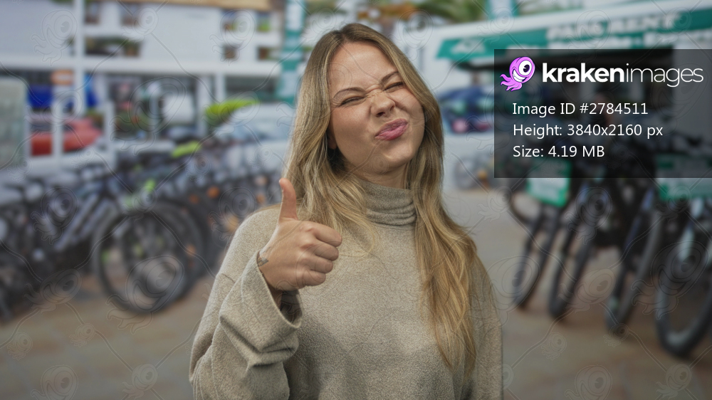 Young blonde woman displays open palms toward row of rental bicycles at bike station in street scene; curiosity delight.