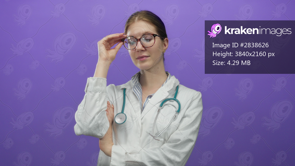 Young blonde woman doctor adjusts glasses with stethoscope in purple studio; confidence expertise care.