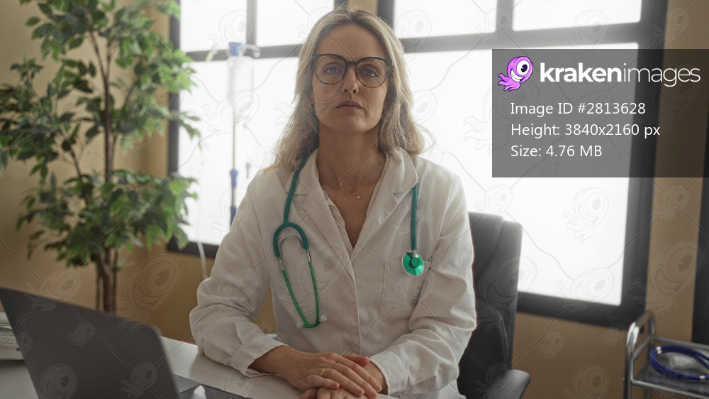 Young blonde woman doctor in a clinic wearing a white coat with a stethoscope, sitting confidently with crossed arms in a bright hospital room, surrounded by medical equipment. - Kraken Images
