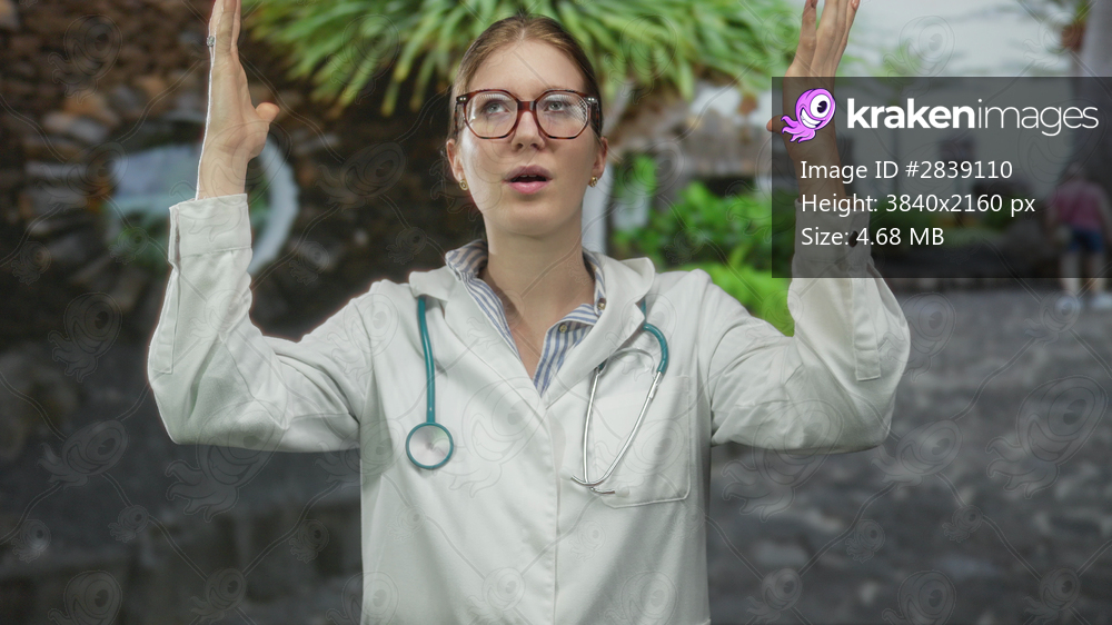 Young blonde woman doctor raises arms with stethoscope while standing in forest; confidence resilience empowerment.