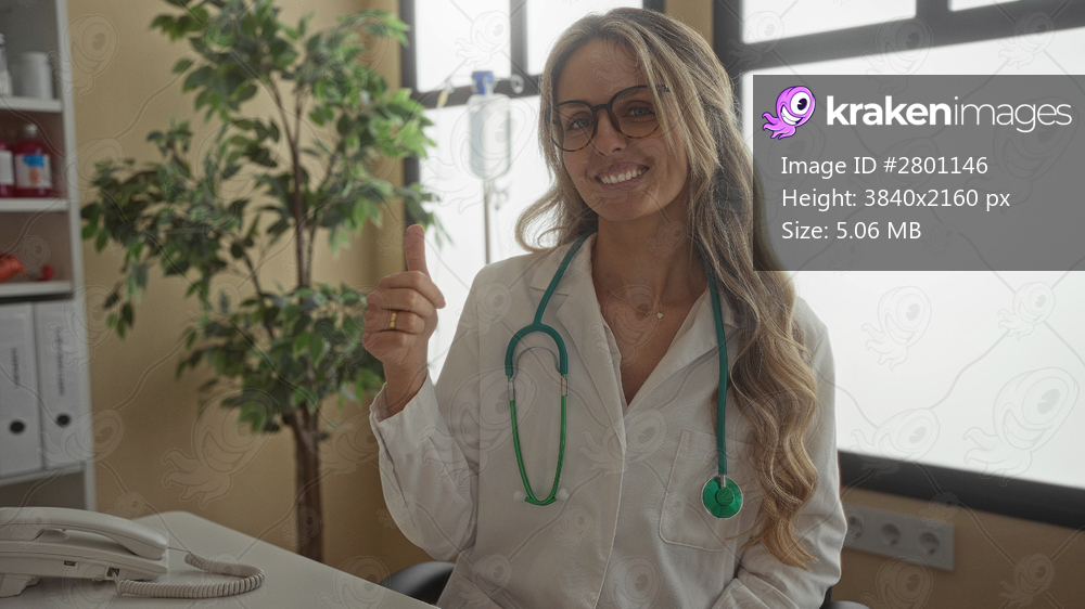 Young blonde woman doctor with stethoscope in hospital clinic room showcasing professional and approachable atmosphere in modern medical workplace