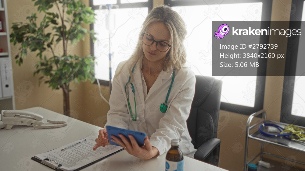 Young blonde woman doctor wearing stethoscope and uniform uses tablet in clinic hospital room indoor setting.