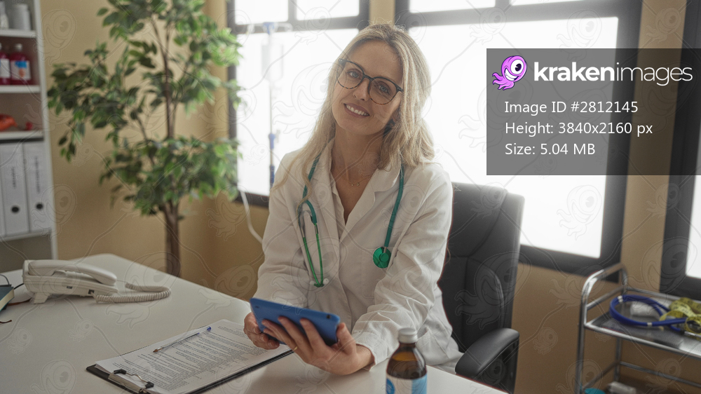 Young blonde woman doctor wearing stethoscope and uniform uses tablet in clinic hospital room indoor setting.