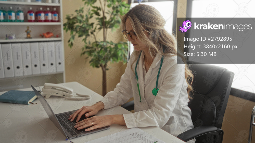 Young blonde woman doctor wearing uniform with stethoscope works on laptop in modern hospital clinic room interior.