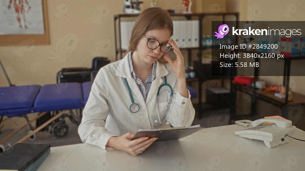 Young blonde woman doctor wearing white coat and stethoscope adjusts glasses while reading a tablet in a clinic office; concentration.