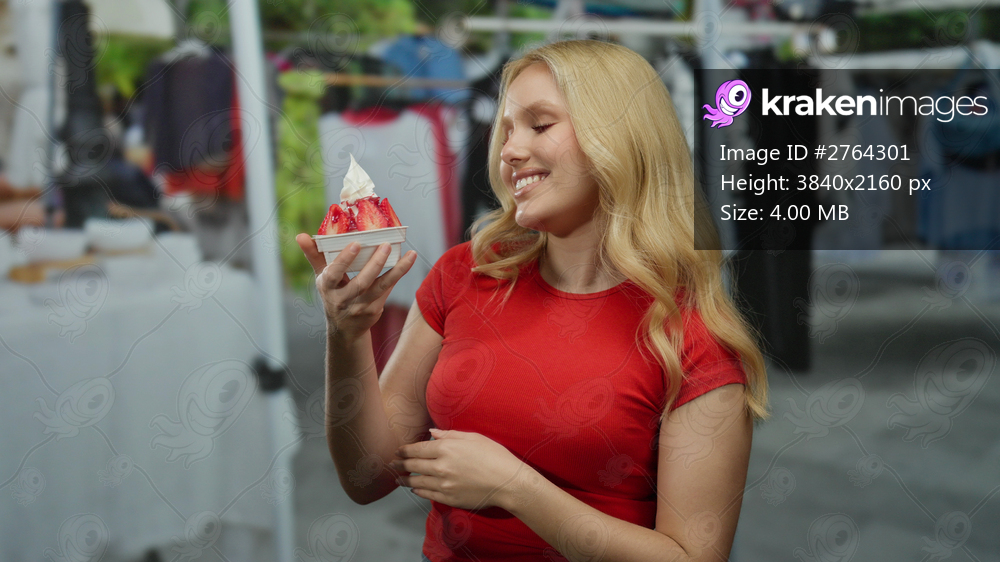 Young blonde woman enjoying ice cream with strawberries outdoors on a city street.