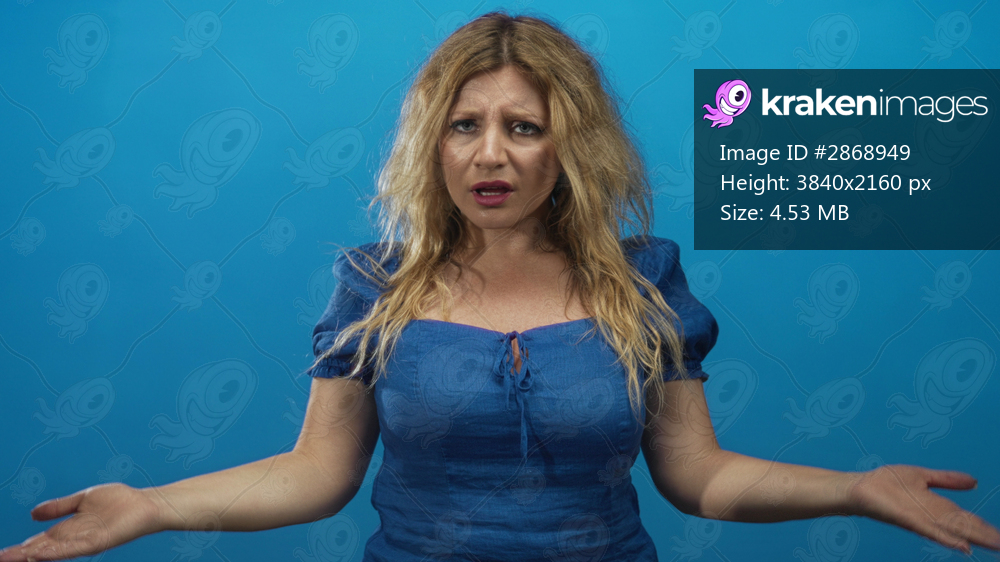 Young blonde woman with exposed chest pulling at ears and shrugging in blue studio under soft light; confusion.