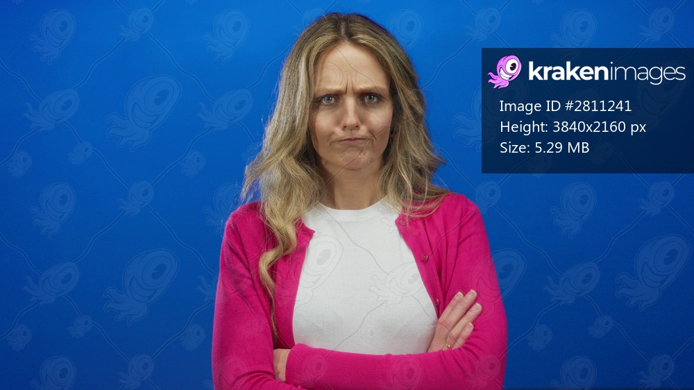 Young blonde woman expressing frustration in a pink sweater against an isolated blue background.