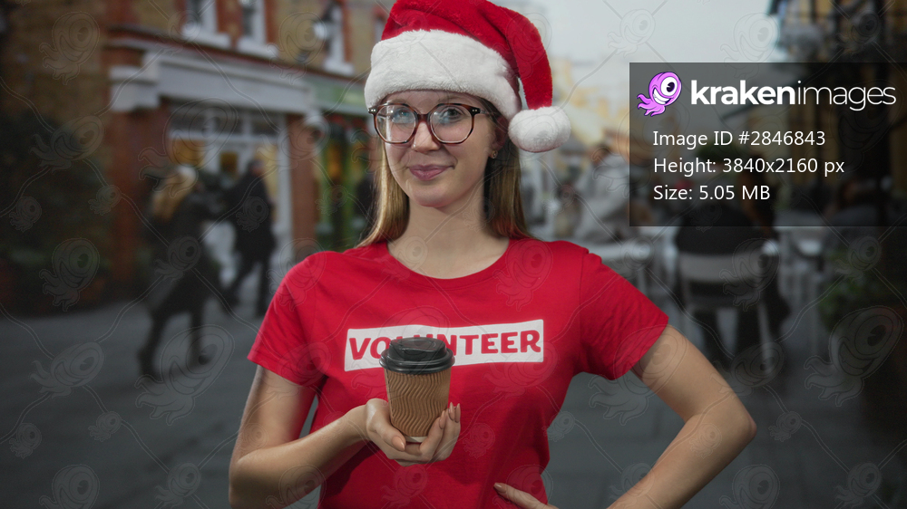 Young blonde woman extends a coffee cup with outstretched hand on bustling city street; cheerful generosity.