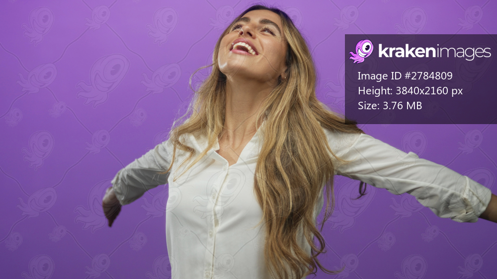 Young blonde woman extends bare toned arms in purple studio setting; freedom joy happiness optimism.