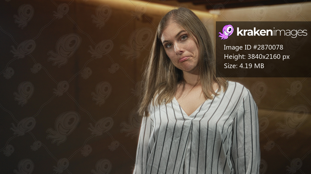 Young blonde woman face smiles then frowns with shifting expression in studio under warm lighting wearing striped blouse; melancholy.