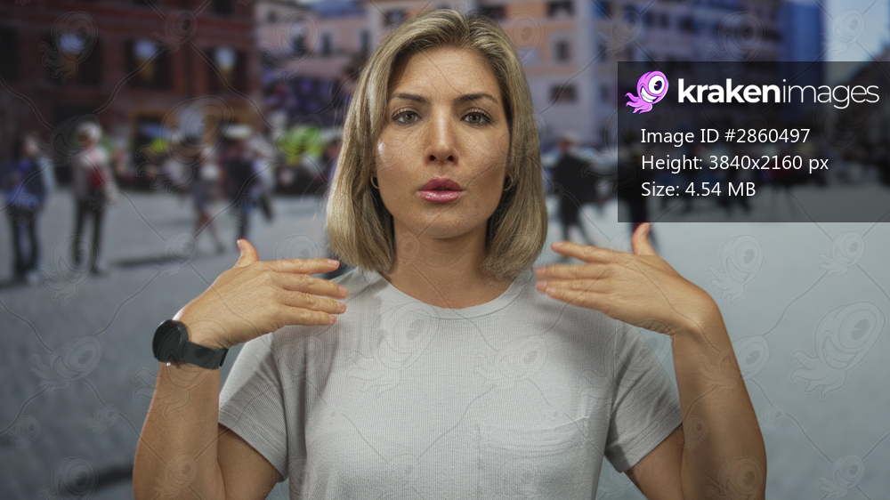 Young blonde woman fans face with hands on busy city street amid blurred crowd and buildings while wearing light t shirt and wristwatch; relief cooling. - Kraken Images