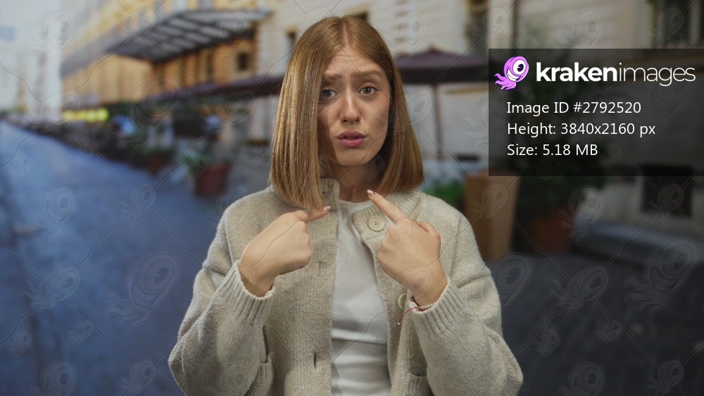 Young blonde woman with finger pointing to chest and confused expression in city street; confusion self doubt.