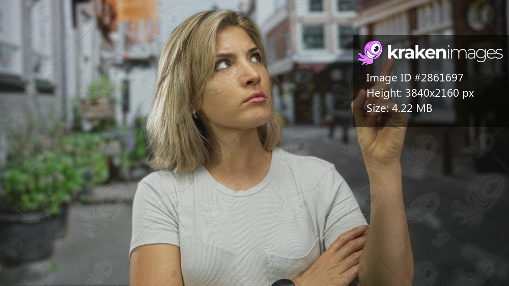 Young blonde woman finger pointing while looking upward on sunlit street flanked by brick buildings; curiosity.