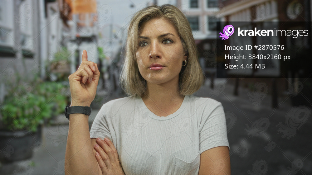 Young blonde woman finger pointing while looking upward on sunlit street flanked by brick buildings; curiosity.