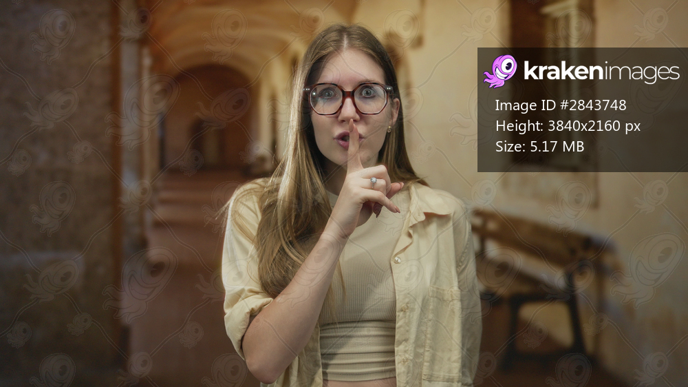 Young blonde woman finger to lips for silence in stone building hallway; quiet introspection secrecy mystery.