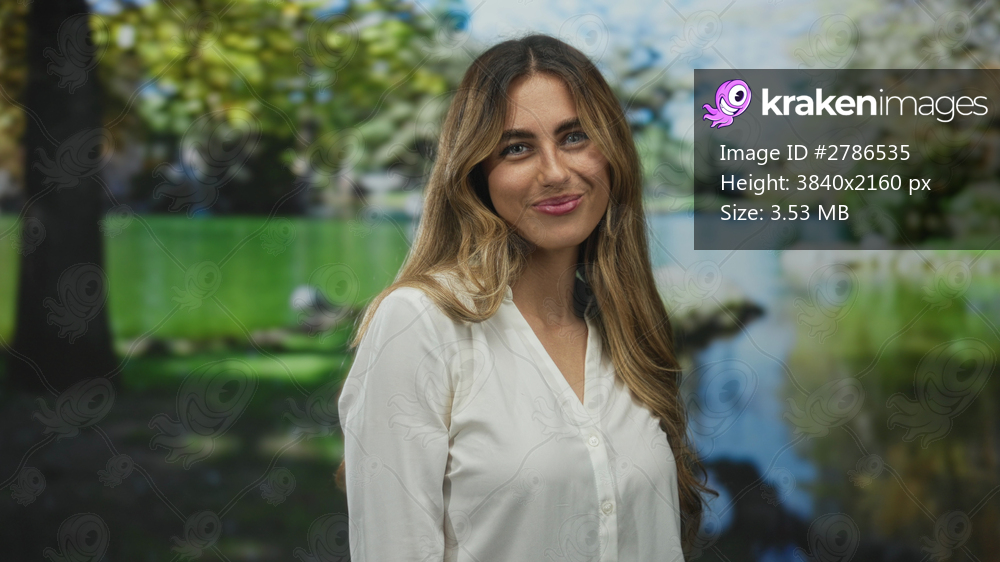 Young blonde woman fingers forming heart sign by sunlit city park pond; love affection warmth friendship.