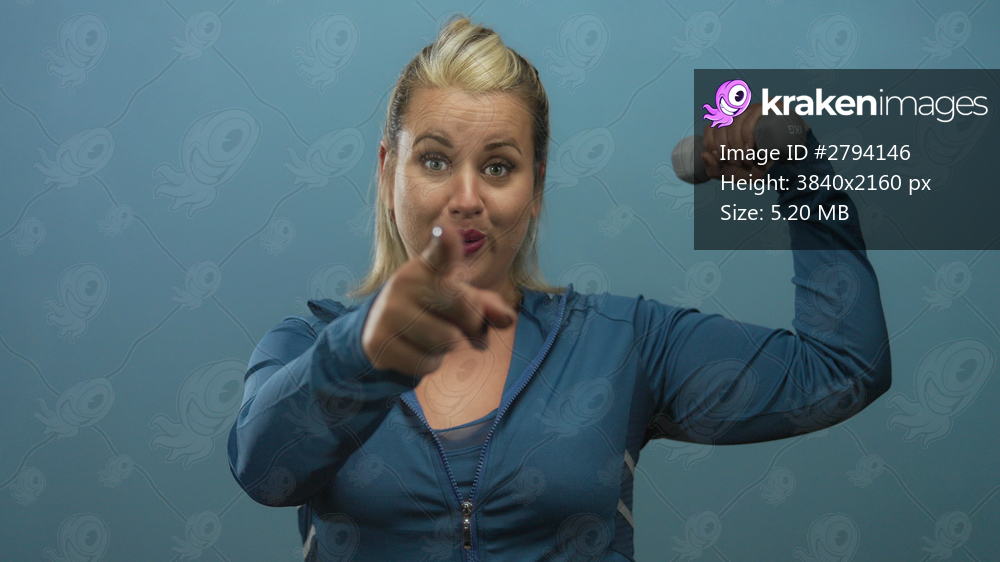 Young blonde woman flexes bare arm with a dumbbell against blue studio wall; confidence motivation.
