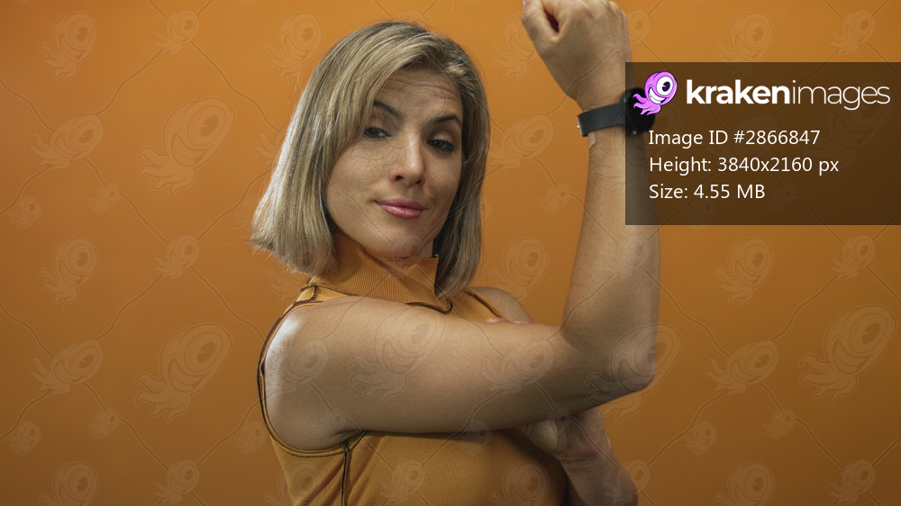 Young blonde woman flexes right bicep in vibrant orange studio; empowerment strength confidence resilience.