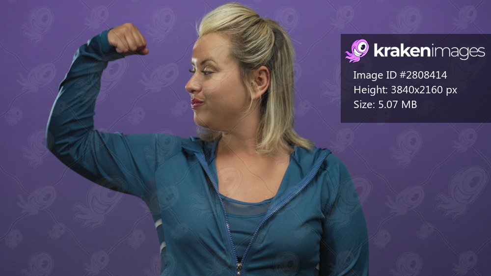 Young blonde woman flexing bicep and smiling in studio; empowerment confidence resilience motivation.