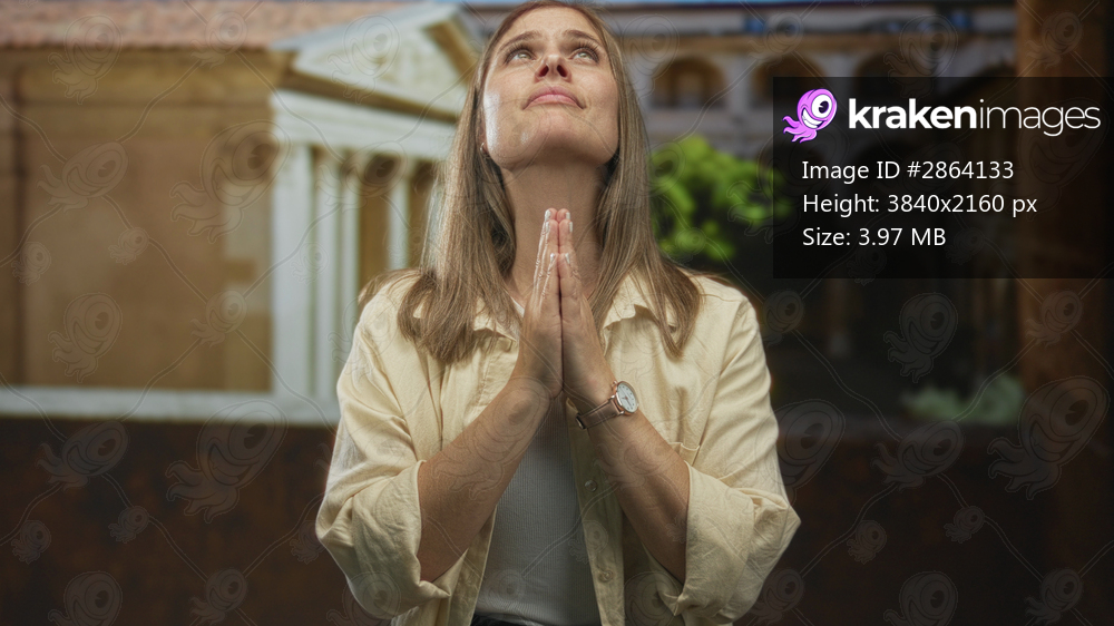 Young blonde woman with folded hands in prayer at sunlit historic building columns amid warm afternoon light; faith serenity.