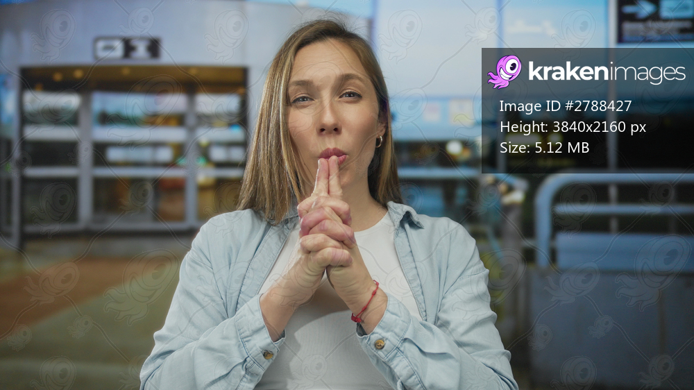 Young blonde woman forms finger gun gesture in airport terminal; threat playfulness.