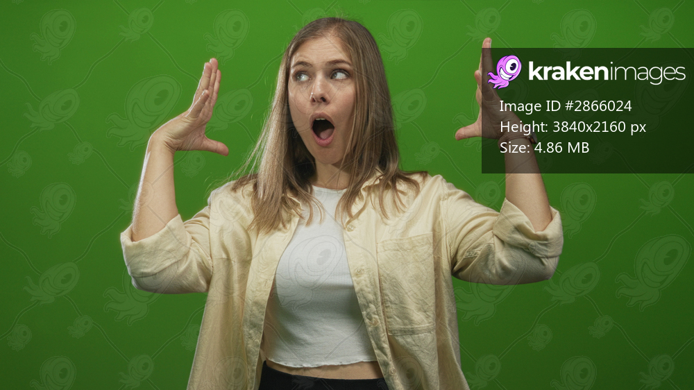 Young blonde woman frames face with hands while looking at camera in bright green studio set; astonishment.