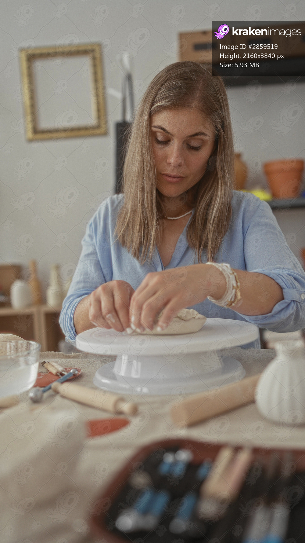 Young blonde woman gently shapes clay pot with both hands on a rotating pottery wheel in a bright artisan studio; serenity.