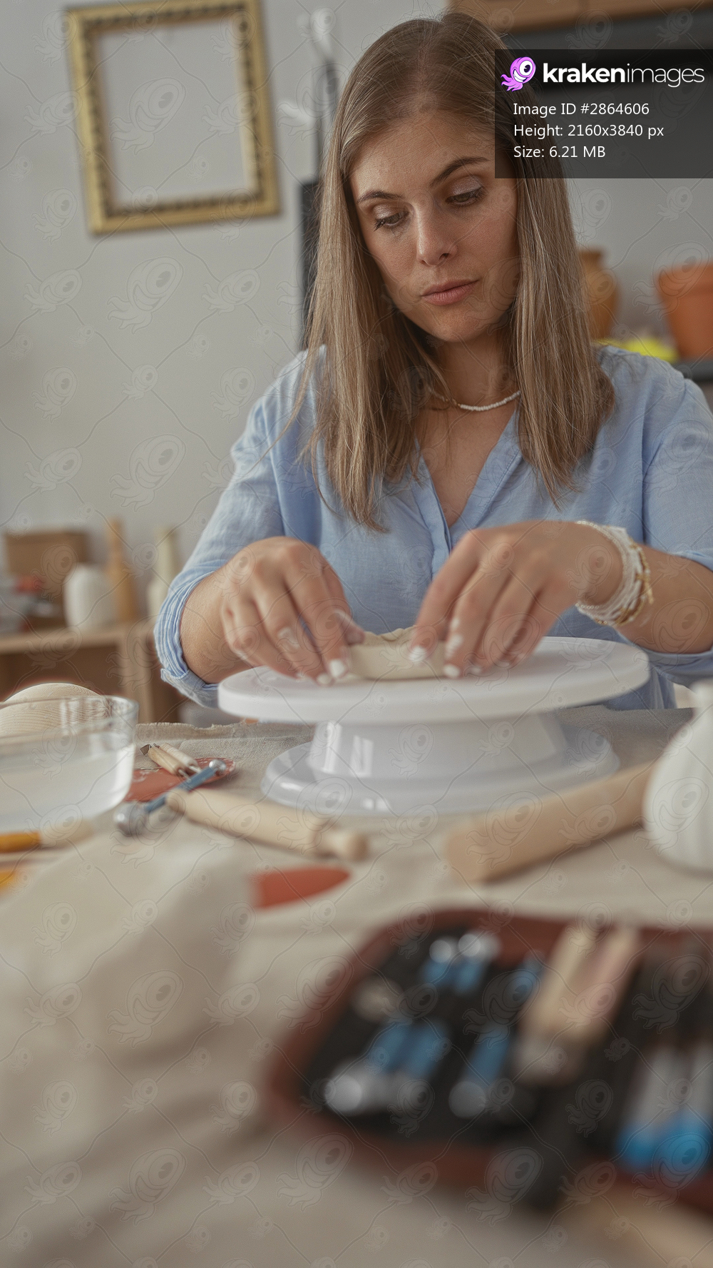 Young blonde woman gently shapes clay pot with both hands on a rotating pottery wheel in a bright artisan studio; serenity.