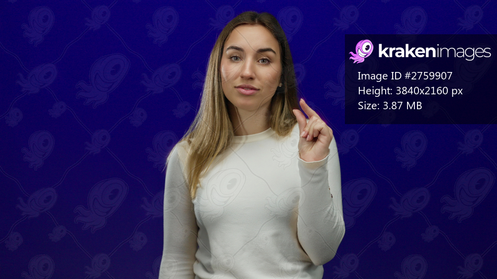 Young blonde woman gestures small size over isolated blue background, wearing a white shirt, conveying a minimal concept with her expression and pose.