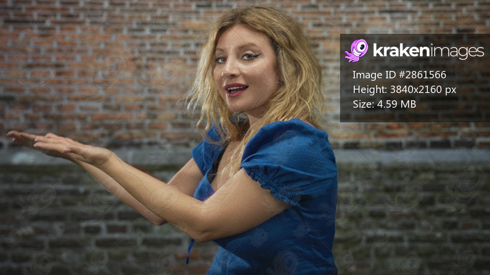 Young blonde woman gesturing with hands and bare arms while adjusting hair against brick building facade wearing blue dress; playful confidence.