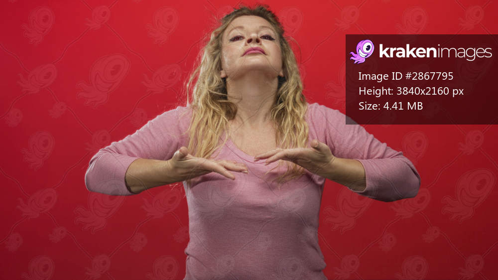 Young blonde woman gesturing with hands near chest and tilting head in red studio in pink sweater; confidence empowerment.