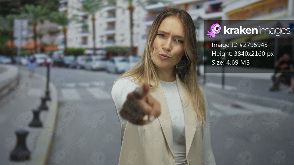 Young blonde woman gesturing on a busy city street with buildings and cars in the background pointing and inviting with hand implying connection and interaction in an urban outdoor setting - Kraken Images