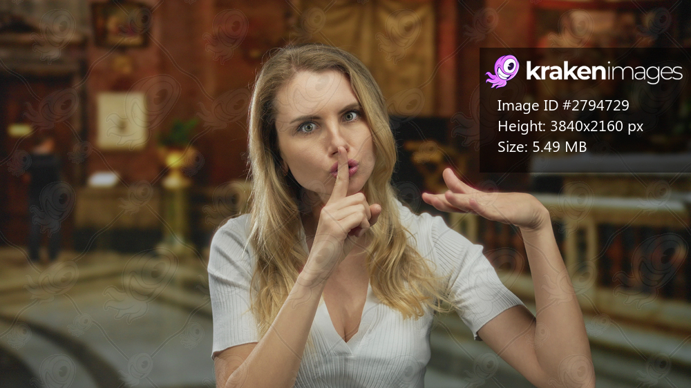 Young blonde woman gesturing silence inside a church with ornate decorations and soft lighting, emphasizing a calm and reverent environment suitable for reflection. - Kraken Images