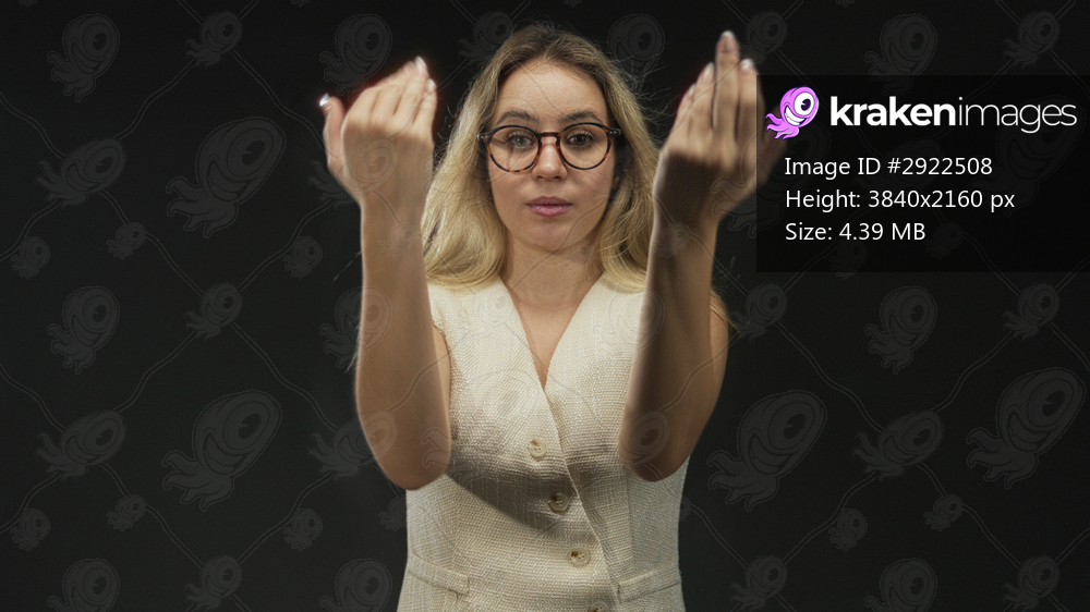 Young blonde woman with glasses and beige vest, arms crossed and hands moving in black studio set; defiance rejection.