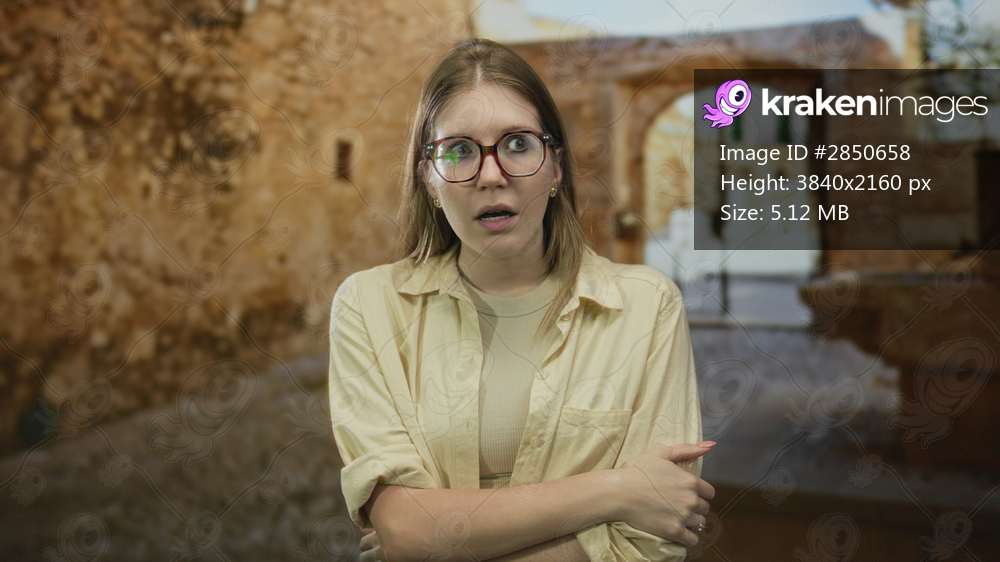 Young blonde woman with glasses covering mouth with hand for surprise on cobblestone street in old town; surprise.