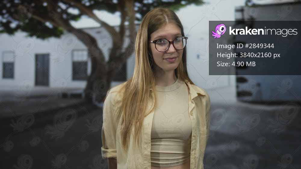 Young blonde woman with glasses shaking head beside white building wall under tree canopy on quiet street; denial.