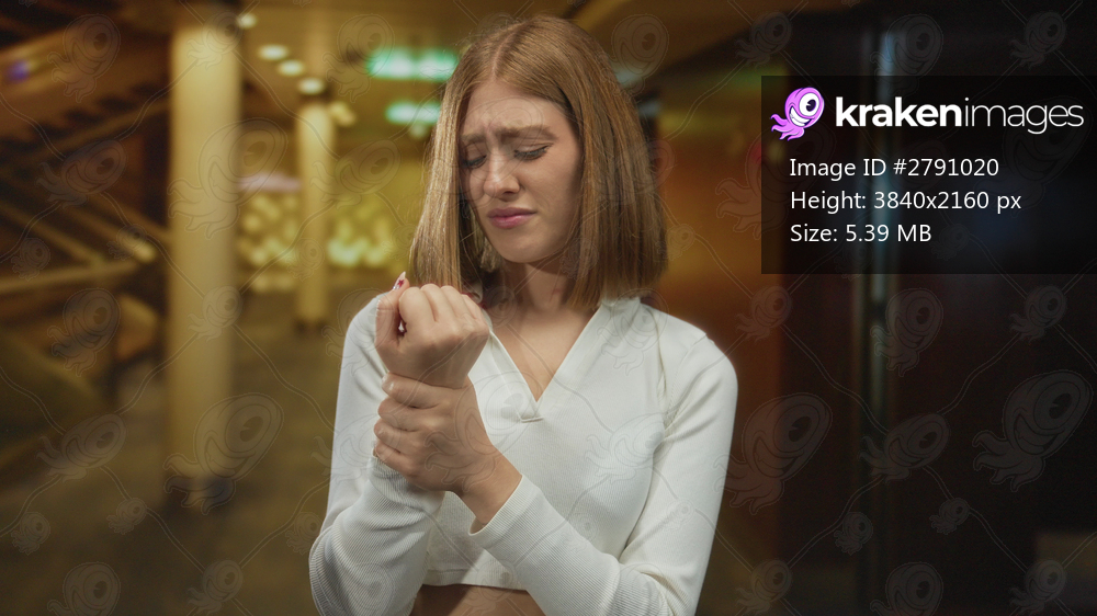 Young blonde woman grips her bare wrist in pain gesture inside hotel corridor; discomfort injury strain anxiety.