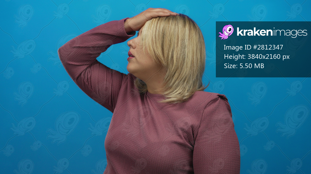 Young blonde woman with hand on forehead and closed eyes against a blue studio wall; surprise astonishment.