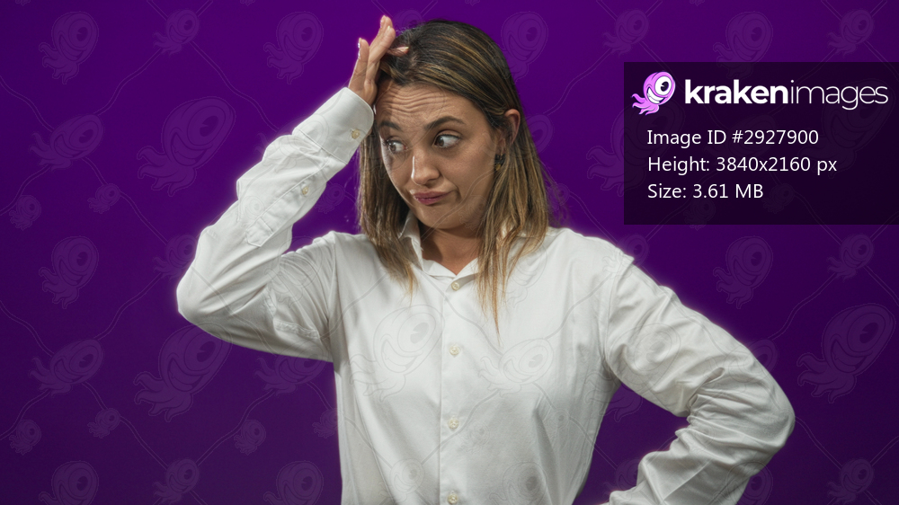 Young blonde woman with hand on forehead and other hand on hip in studio against purple backdrop; frustration doubt fatigue.