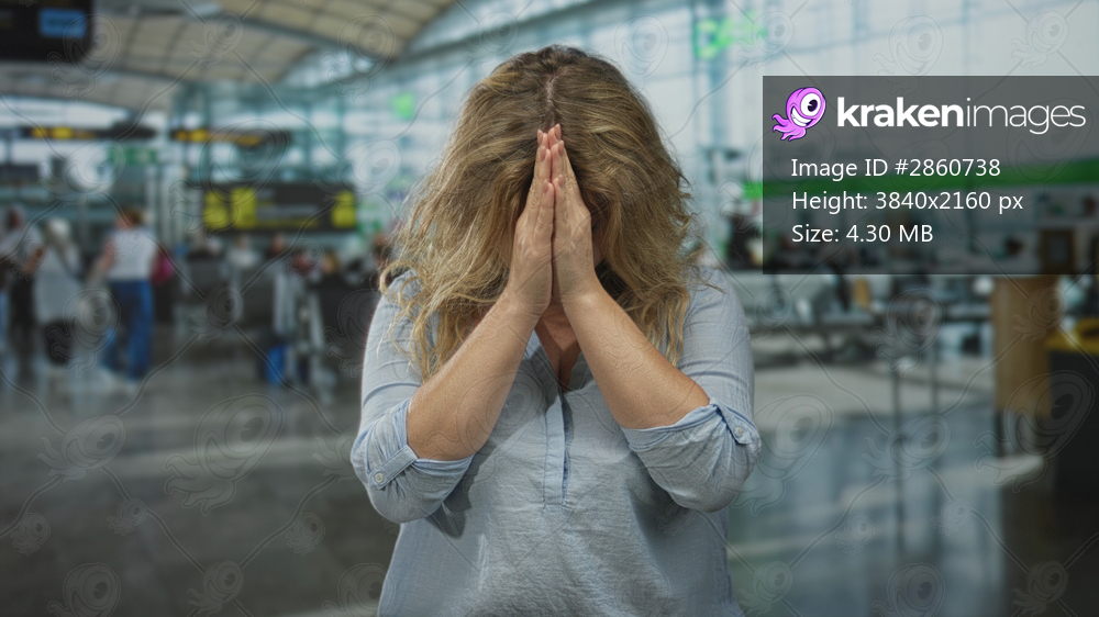 Young blonde woman with hands covering face at airport terminal departure lounge; travel delay anxiety.