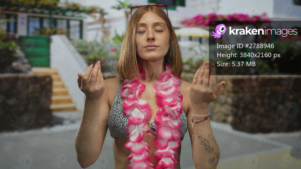 Young blonde woman hands in breathing gesture on urban street with floral lei and bikini top; relaxation meditation.