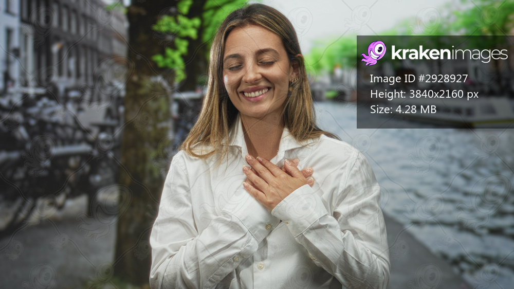 Young blonde woman with hands on chest and closed eyes on a canal street in amsterdam, beside bicycles and a tour boat; grateful.