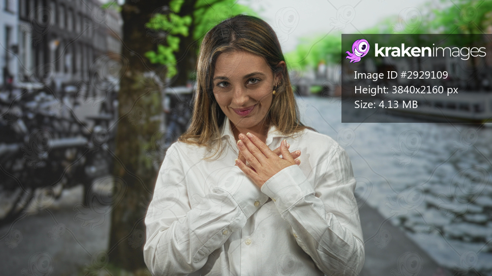 Young blonde woman with hands on chest and closed eyes on a canal street in amsterdam, beside bicycles and a tour boat; grateful.