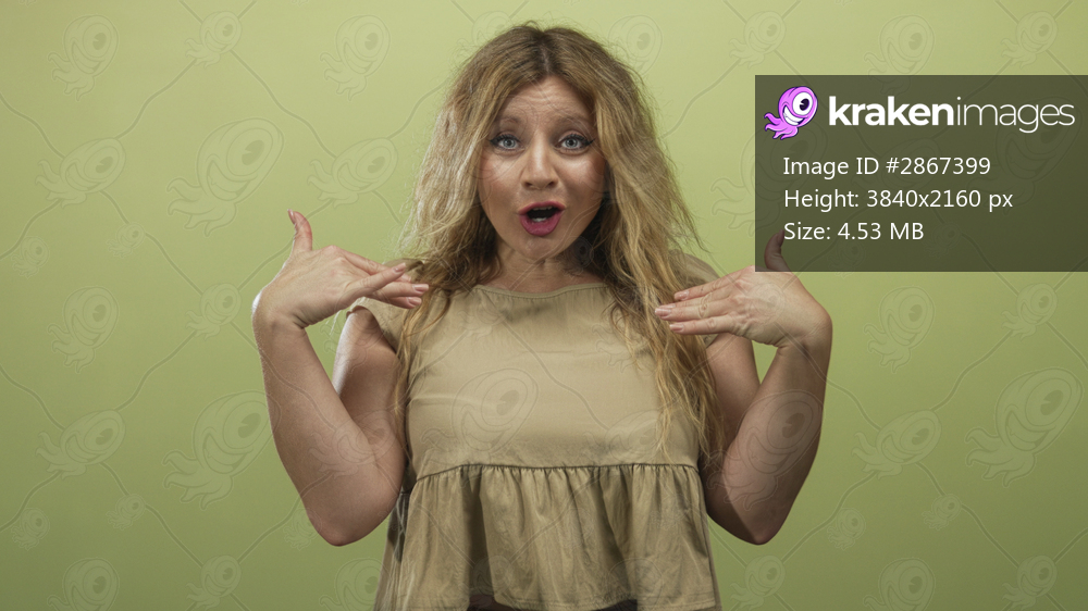 Young blonde woman with hands raised and open mouth in studio with olive green backdrop; surprise celebration.
