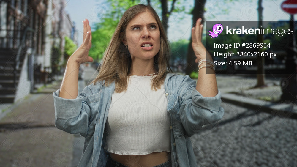 Young blonde woman with hands raised to head on city street amid sunlight and leafy trees; inner stress tension frustration.