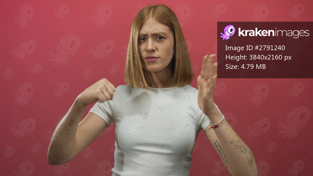 Young blonde woman hits bare palm with a clenched fist in a studio setting while frowning; anger frustration.