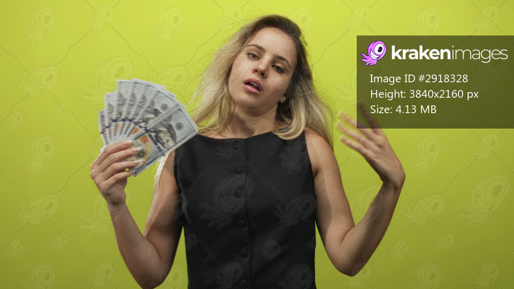 Young blonde woman holding a fan of dollar bills with hand raised fanning cash in a green studio; indifference wealth.